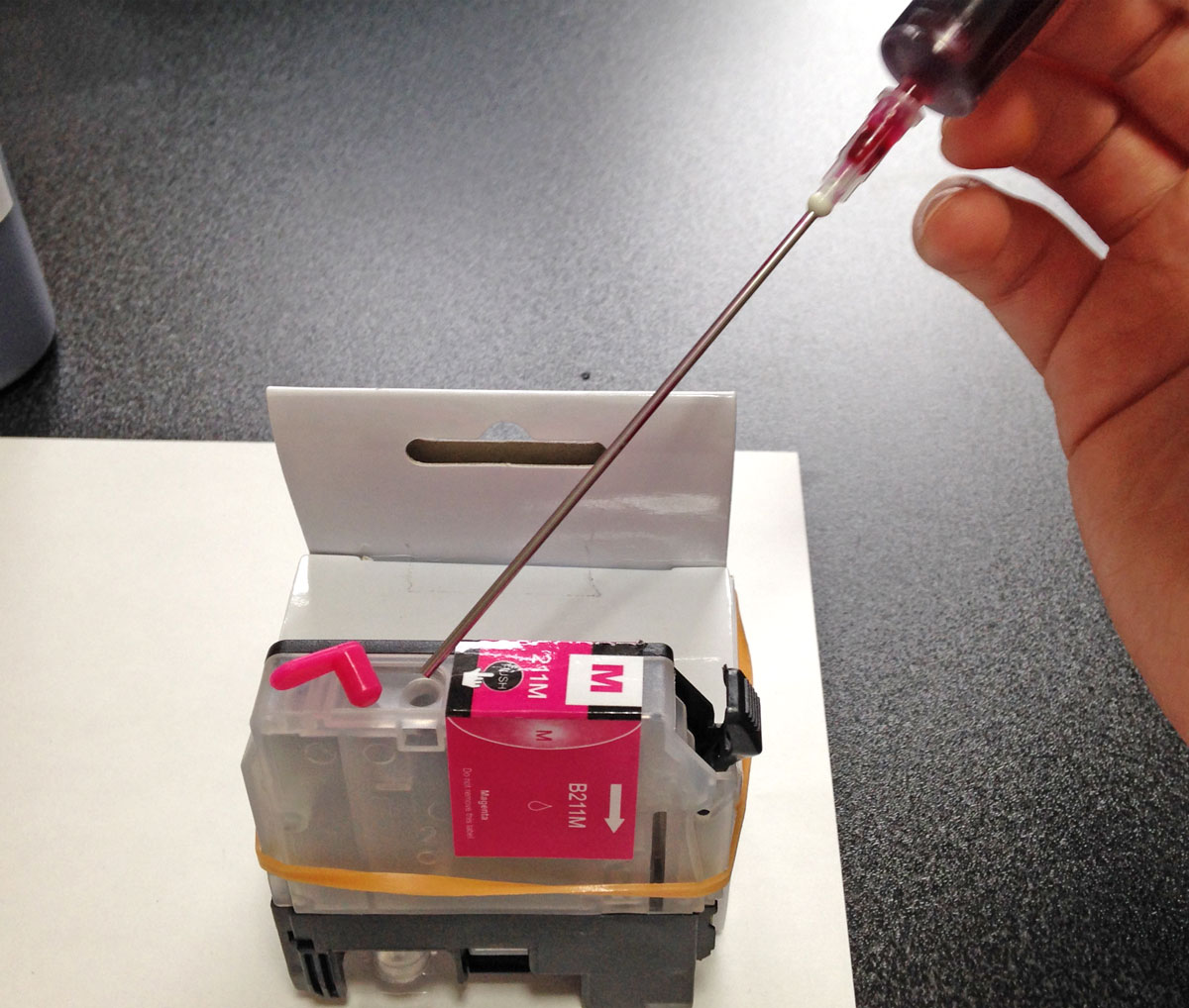 ②純正カートリッジに細工して、詰め替えインクを補充する。