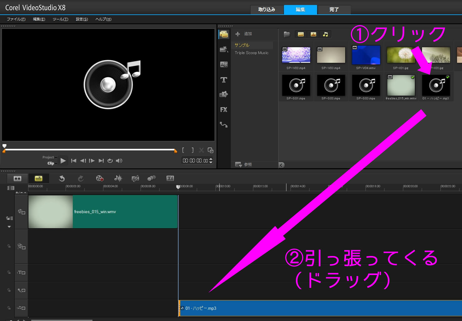 さて、編集画面に戻って先ほど苦労してダウンロードした音楽を入れてみましょう。